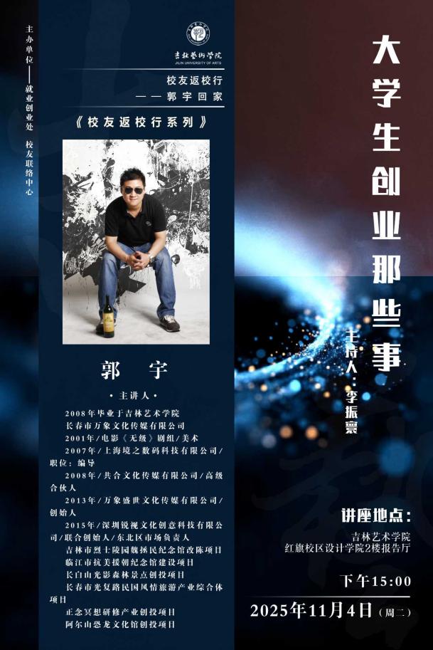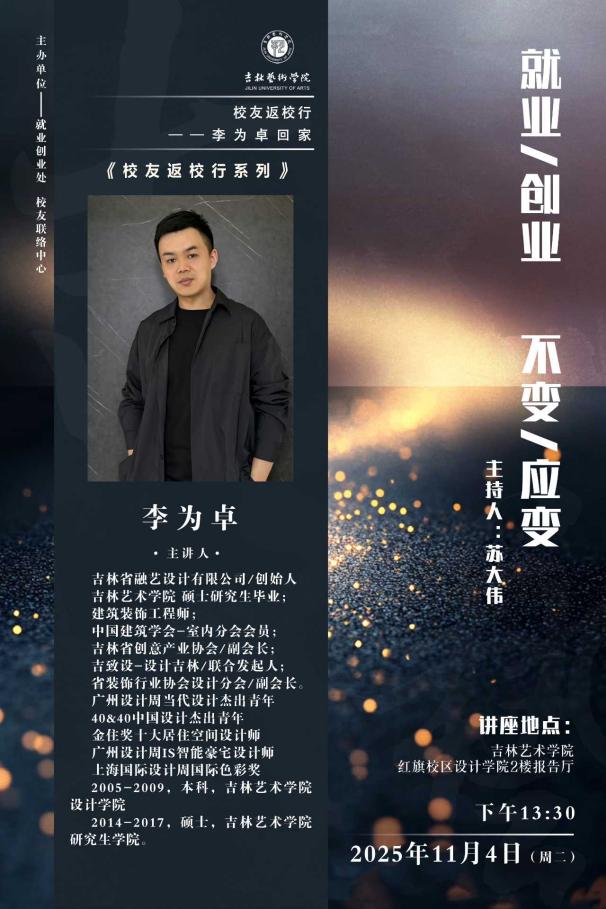 11月4日下午,校友返校行系列活动之“赋能职业之路助力创业梦想”就业创业专题讲座,在吉林艺术学院红旗校区二楼报告厅顺利举办。本次讲座由学院就业创业处、校友联络中心主办,设计学院与新媒体学院共同承办。为精准分享就业创业实战经验,特别邀请吉林省融艺设计有限公司创始人李为卓、长春市万象盛世文化传媒有限公司创始人郭宇两位校友担任主讲嘉宾。活动现场座无虚席,师生及校友参与热情高涨,反响热烈。