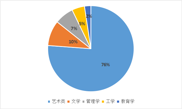 目前,学校共有本科专业42个,涉及艺术学、文学、管理学、教育学、工学等5个学科门类,其中艺术类专业32个,占专业总数的76%。